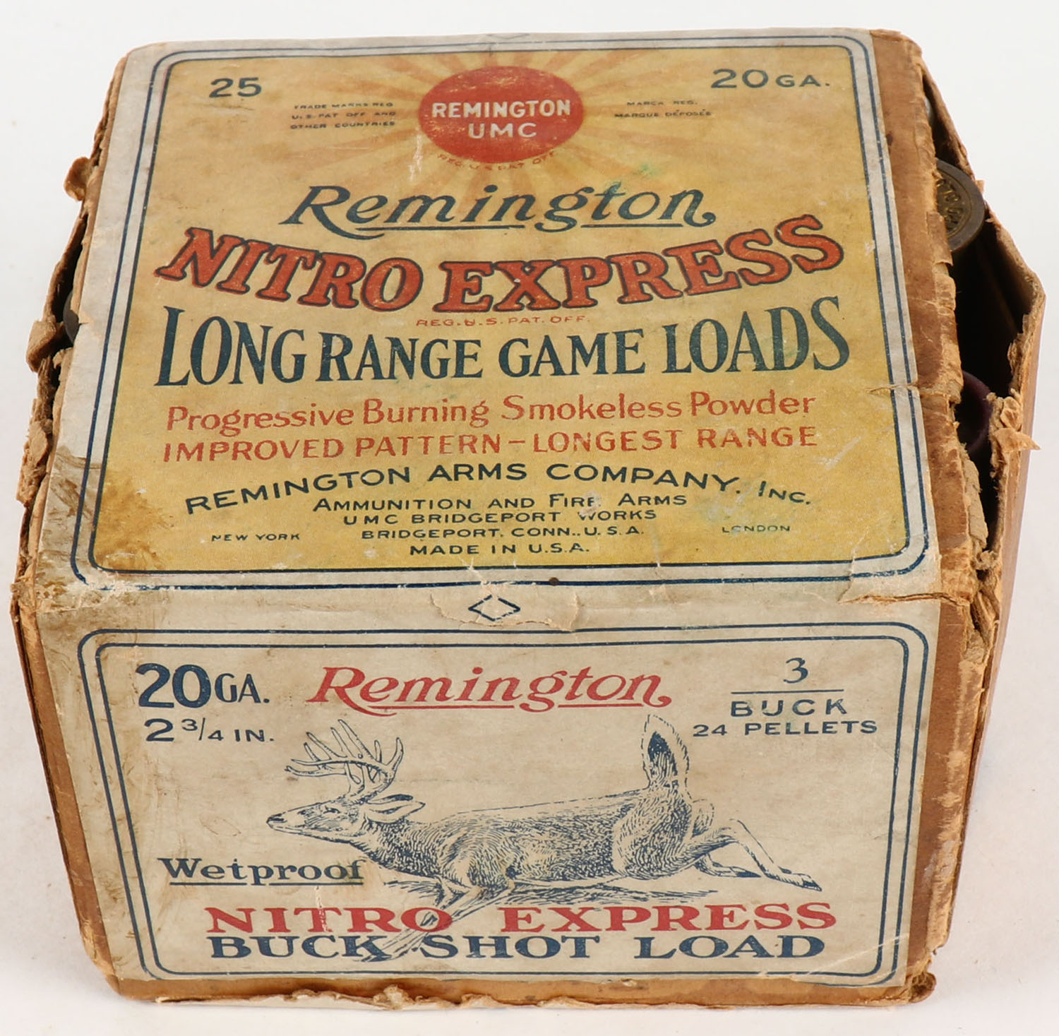 Remington UMC Nitro Express, Long Range Game Loads, pictures Buck jumping, 20ga., 2pc., Partial 23rds., shot size 3 BUCK, buff box with sunburst logo & BUCK on side, box has seam splits with edge wear, scuffing and soiling, paper shells are very good. Grade: Good - Value: 40 to 200