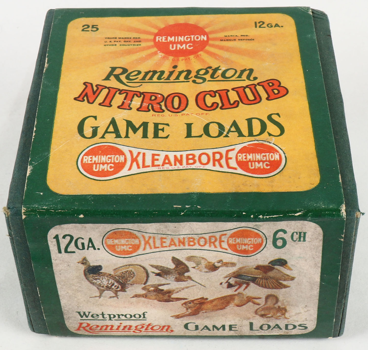 Remington UMC Nitro Club, GAME LOADS, 12ga, 2pc., FULL & SEALED, shot size 6CH, green box with sunburst logo & a variety of animals on the side, box has minor age soiling with excellent colors. Grade: Excellent ++ - Value: 100 to 500