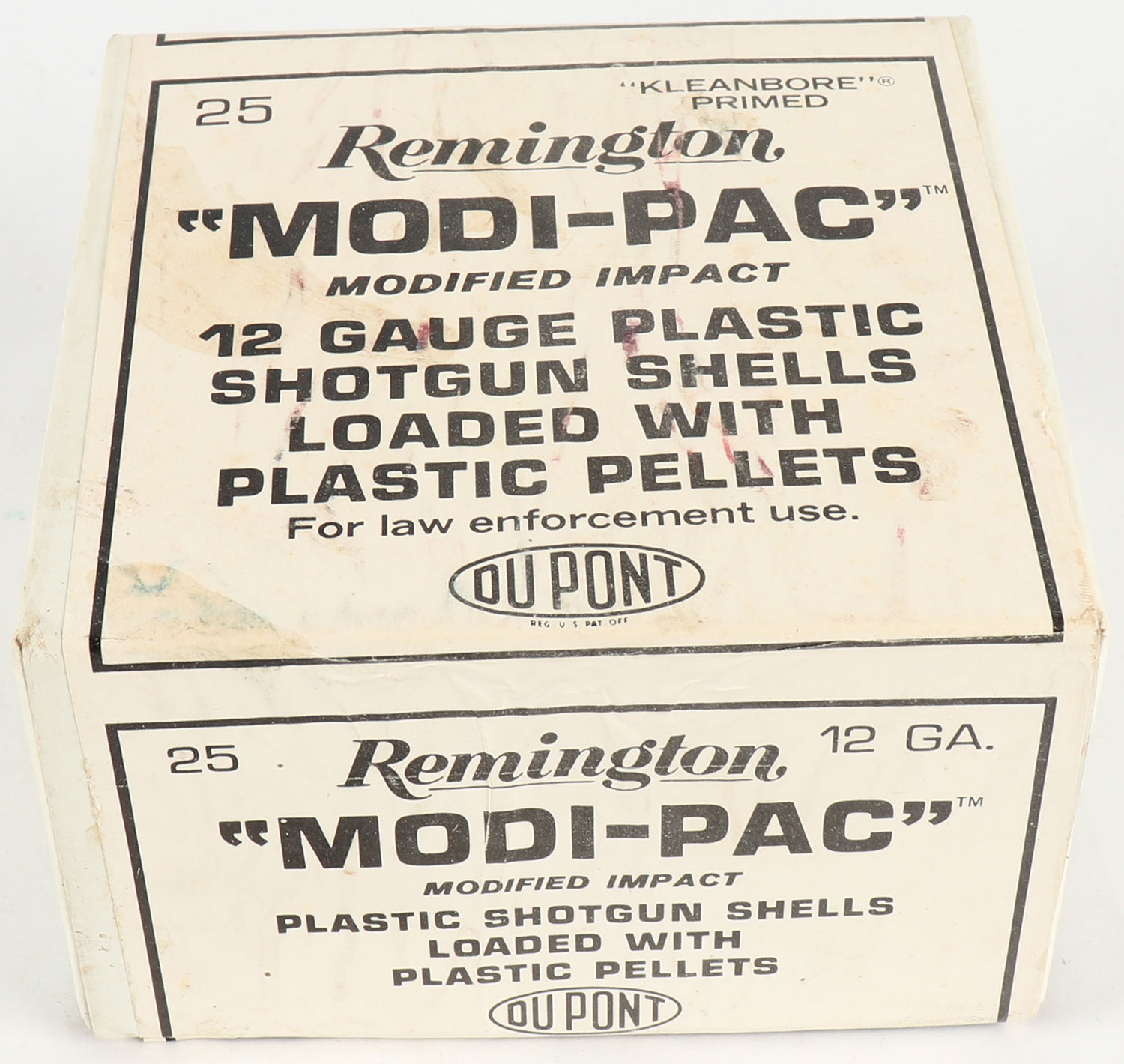 Remington, ''MODI-PAC'', Plastic shotgun shells, 12ga., 2pc., FULL & SEALED, White box with white and black label, box & label are nice with minor scuffing. Grade: Excellent - Value: 20 to 60
