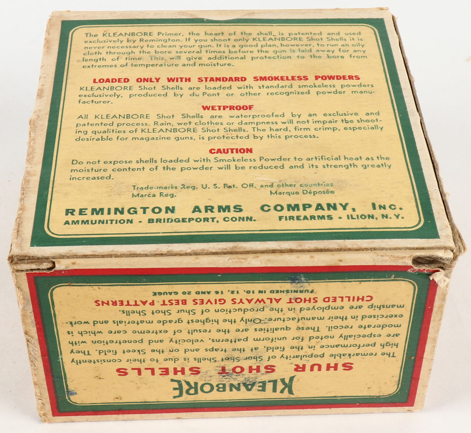 Remington Kleanbore, SHUR SHOT SHELLS, 12ga., 1pc., Full, shot size 6 , box is yellow, red and green, box has light scuffing with great colors, paper shells are excellent. Grade: Excellent - Value: 10 to 50