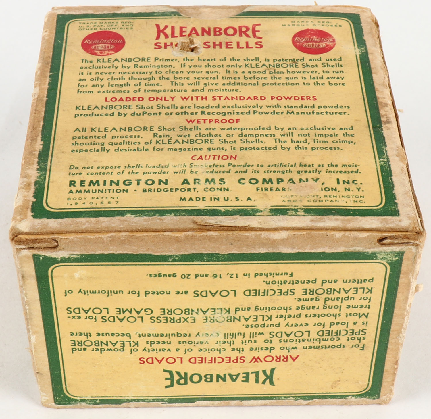 Remington, Kleanbore, ARROW Shells, 20ga., 1pc., 2 1/4'', Full, shot size 8, box is yellow, red and green, box has scuffing with edge wear, paper shells are very good. Grade: Very Good - Value: 10 to 60