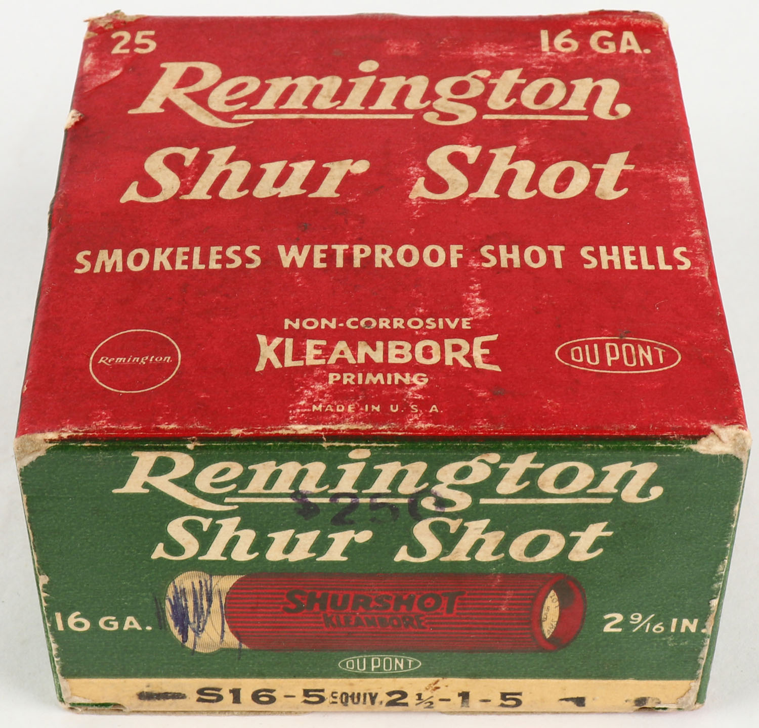 Remington Shur Shot, 16ga., 2 9/16'', 1pc., Full, shot size 5, box is white, yellow, red and green, box has light scuffing, paper shells are excellent. Grade: Excellent - Value: 10 to 40
