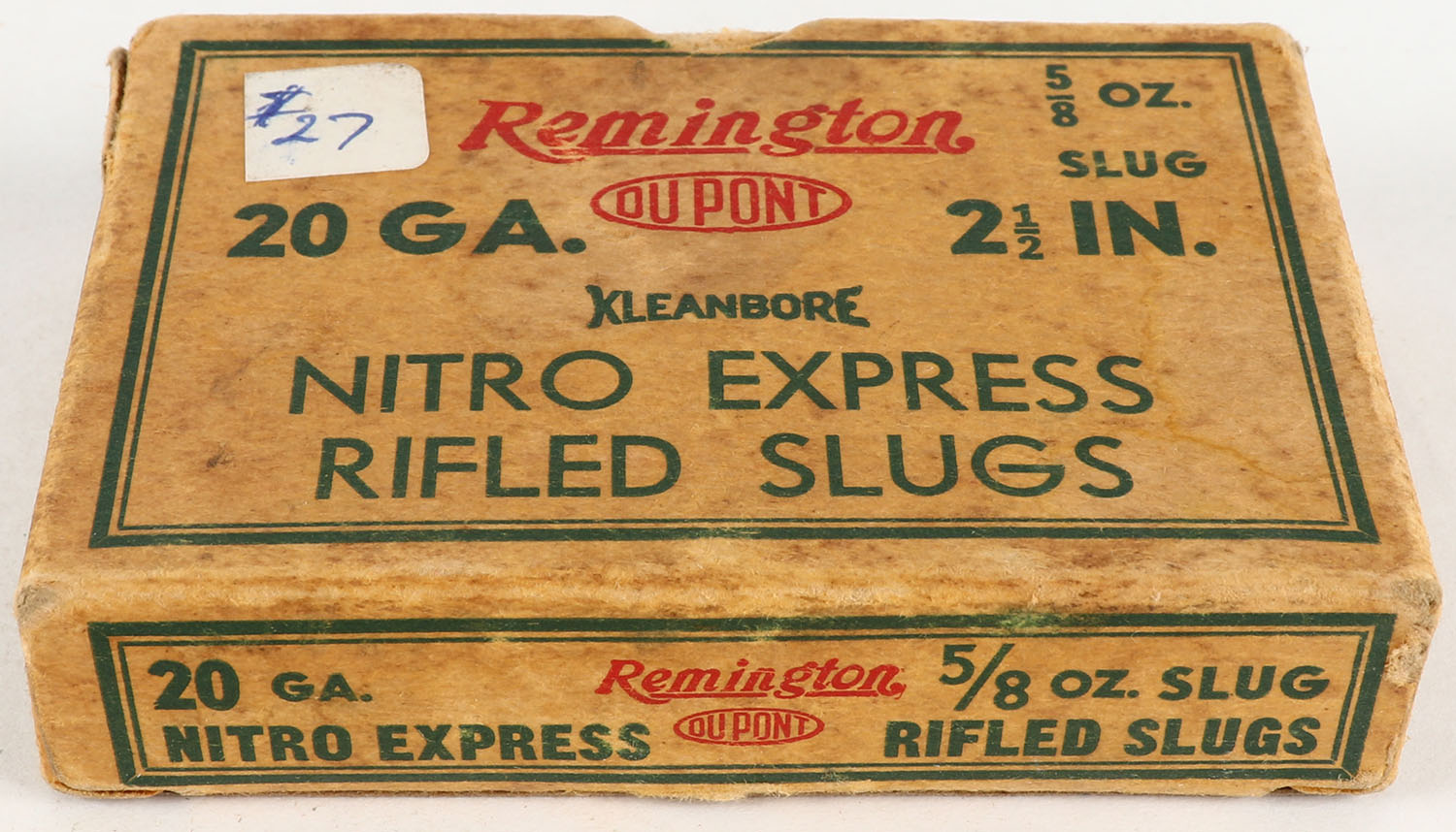 Remington, Kleanbore, NITRO EXPRESS, 20ga., 2 1/2'', 1pc., Full, shot size Rifled Slugs, box is buff, red and green, box is solid with scuffing, paper shells are good. Grade: Very Good - Value: 10 to 30
