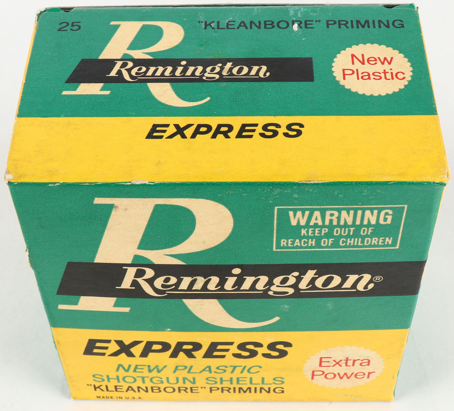 Remington, Express, 10ga., 2 7/8'', 1pc., Full, shot size 4, multi-colored box, box is very solid with great colors, plastic shells are excellent. Grade: Excellent ++ - Value: 20 to 100