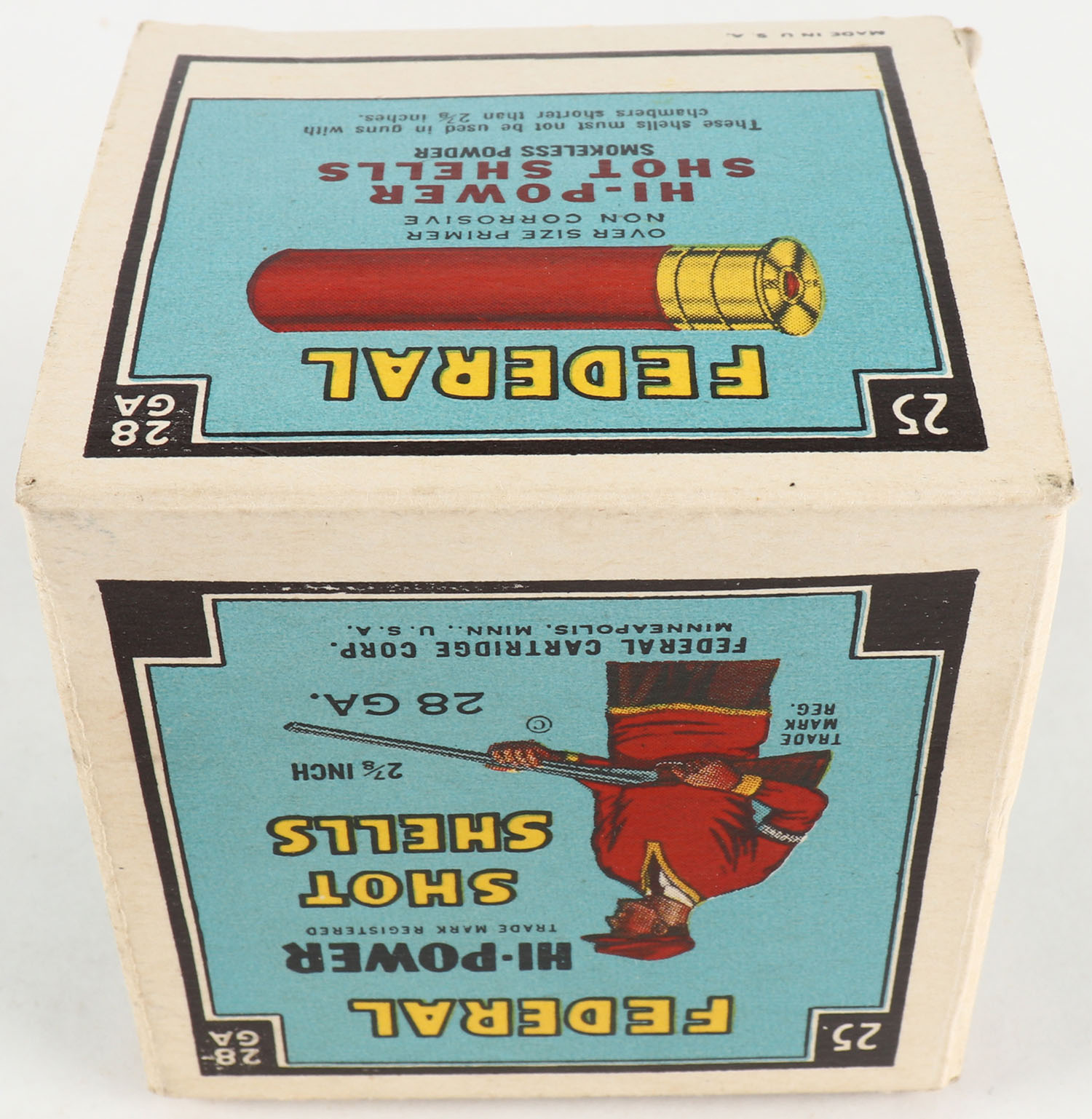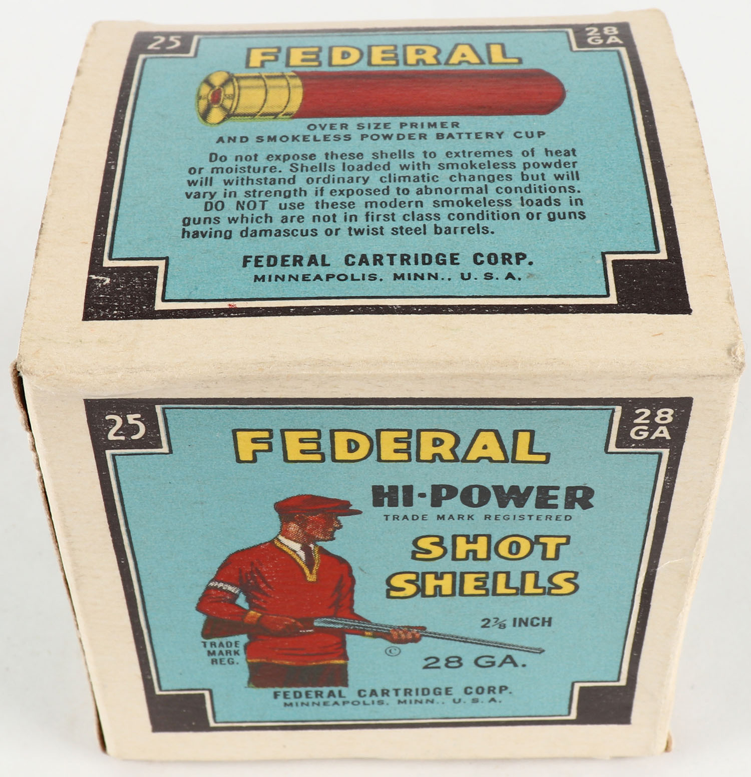 Federal Cart. Co., HI-POWER, 28ga., 2 7/8'', 1pc., Empty, Black border, blue, yellow and red box with Trap Shooter, box is minty with great colors. Grade: MINT - Value: 10 to 50