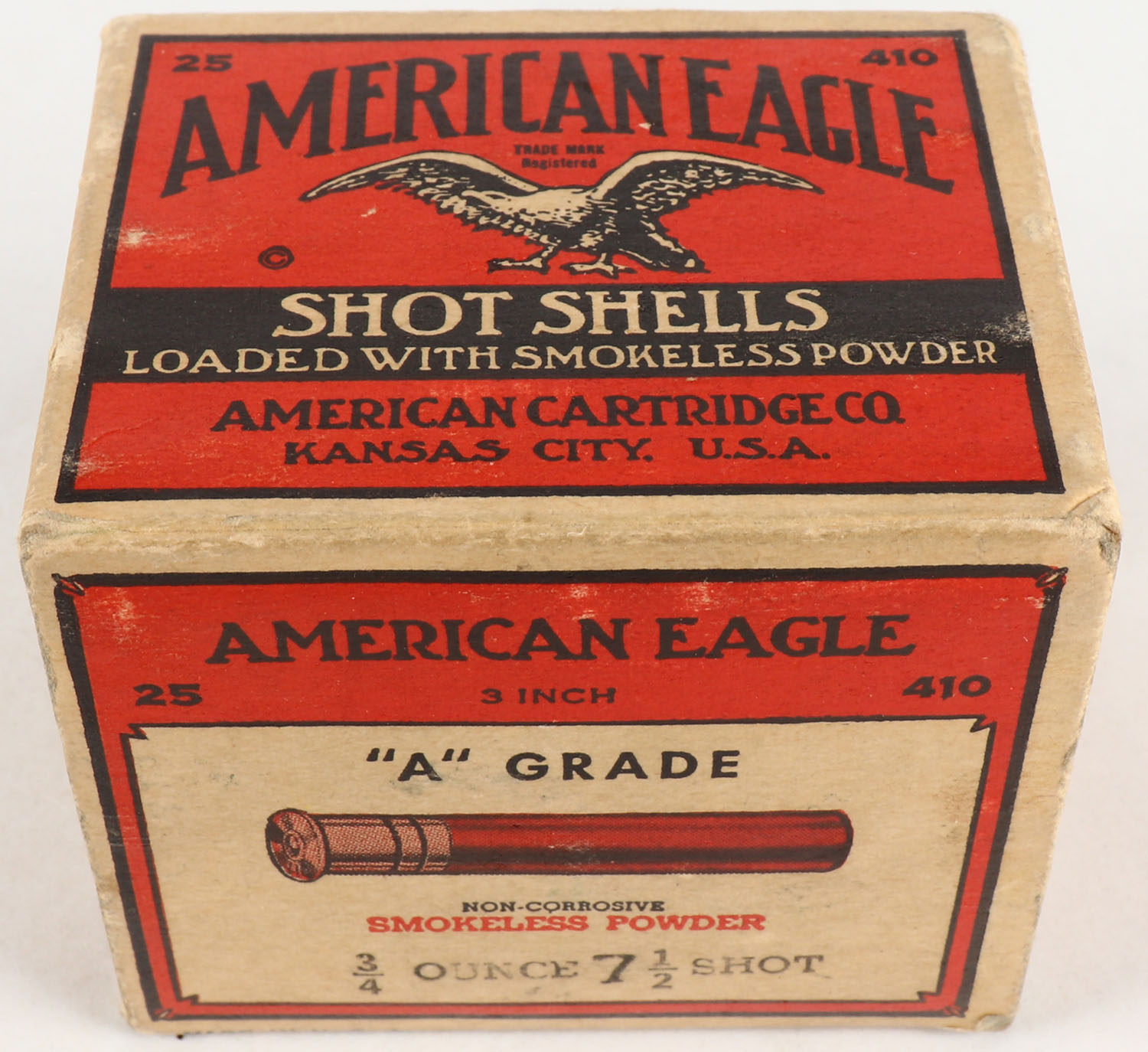 American Cart. Co., A-Grade, 410ga., 1pc., Full, shot size 7 1/2, buff, red & black box that pictures a flying eagle, box is very solid with very nice colors, paper shells are very good. Grade: Excellent - Value: 40 to 250