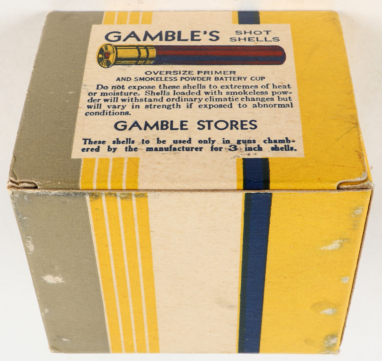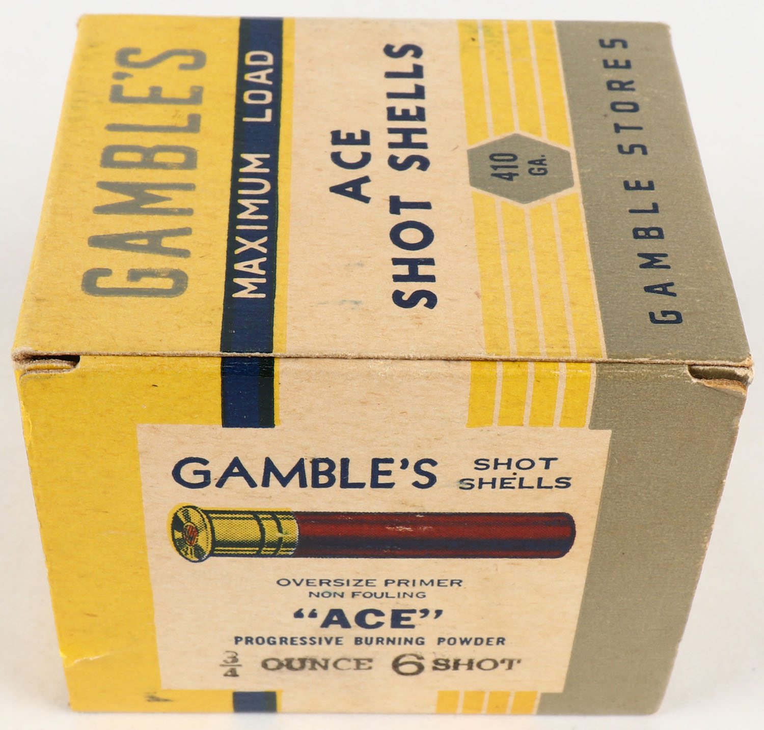 Gamble's, ACE Shot Shells, 410ga., 1pc., Full, 3'', shot size 6, multi-colored box, box is very solid with excellent color, paper shells are excellent. Grade: Excellent - Value: 50 to 250