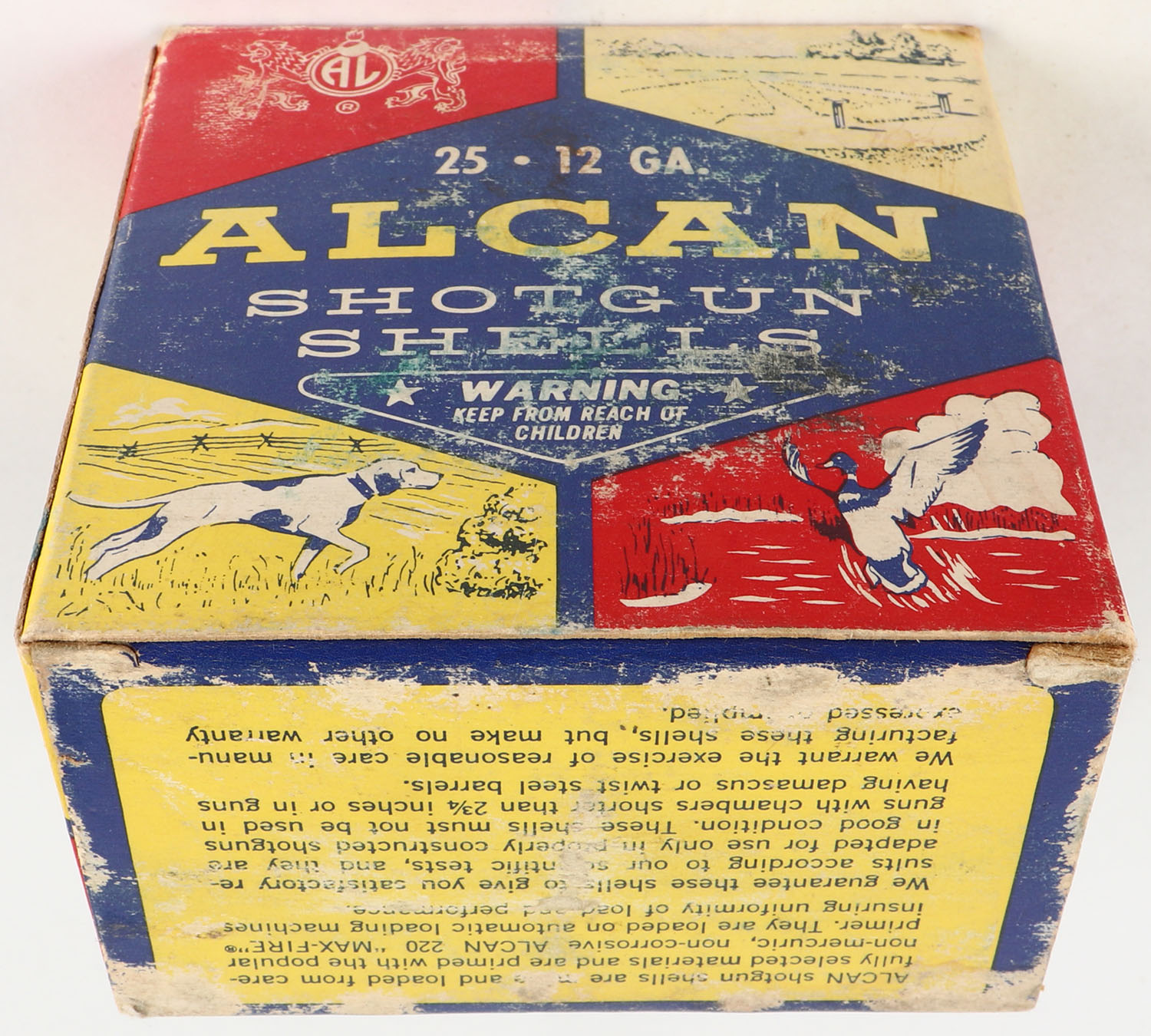 Alcan, Smokeless Powder, Gamemax, 12ga., 2 3/4'', 1pc., Partial with 18rds. Being correct, shot size 6CH, multi-colored box, box has scuffing with great colors, paper shells are excellent. Grade: Very Good + - Value: 10 to 30