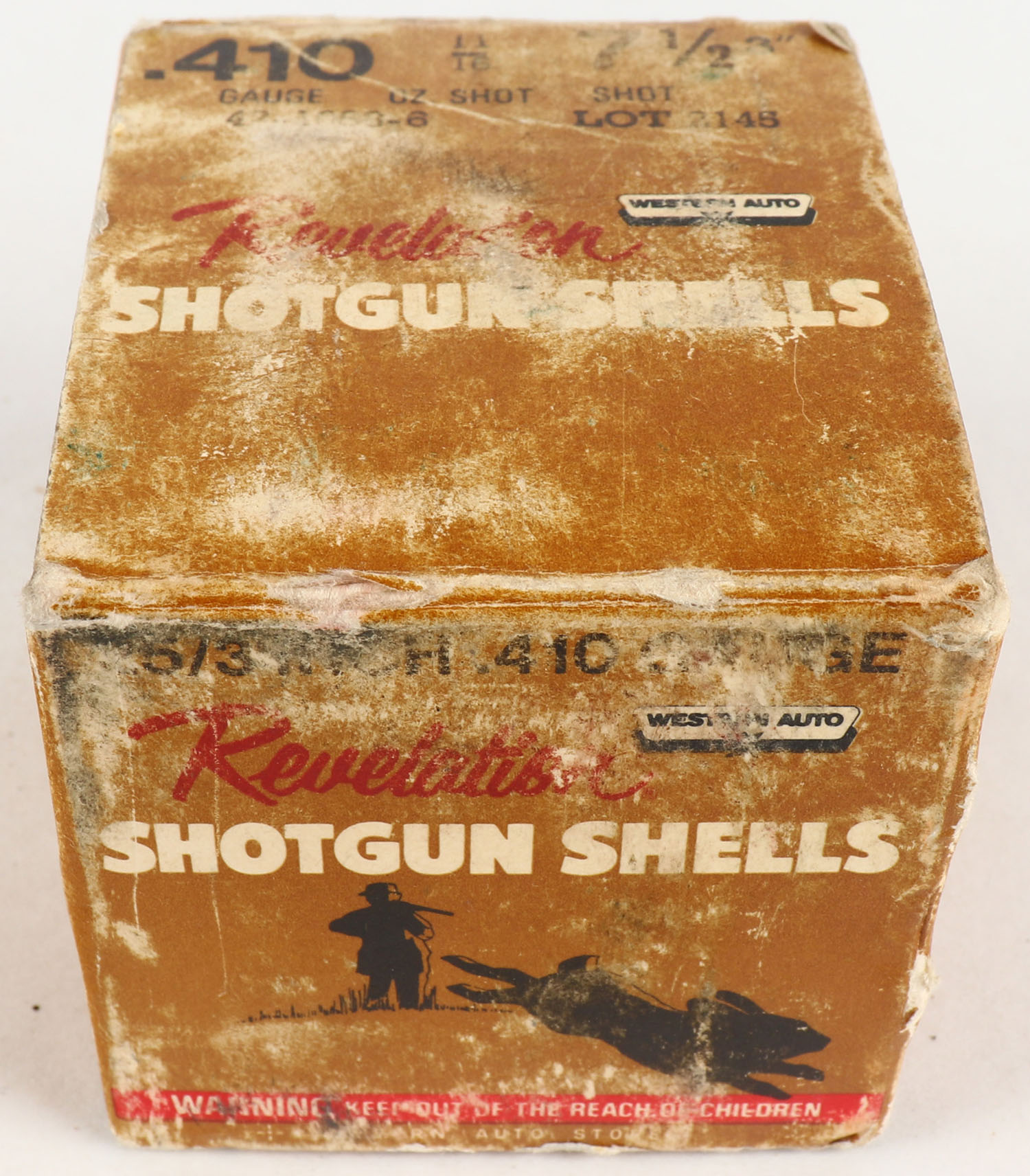Revelation, 410ga., 3'', 1pc., Full, shot size 7 1/2, multi-colored box, box has age soiling with scuffing, plastic shells are excellent. Grade: Good ++ - Value: 10 to 30