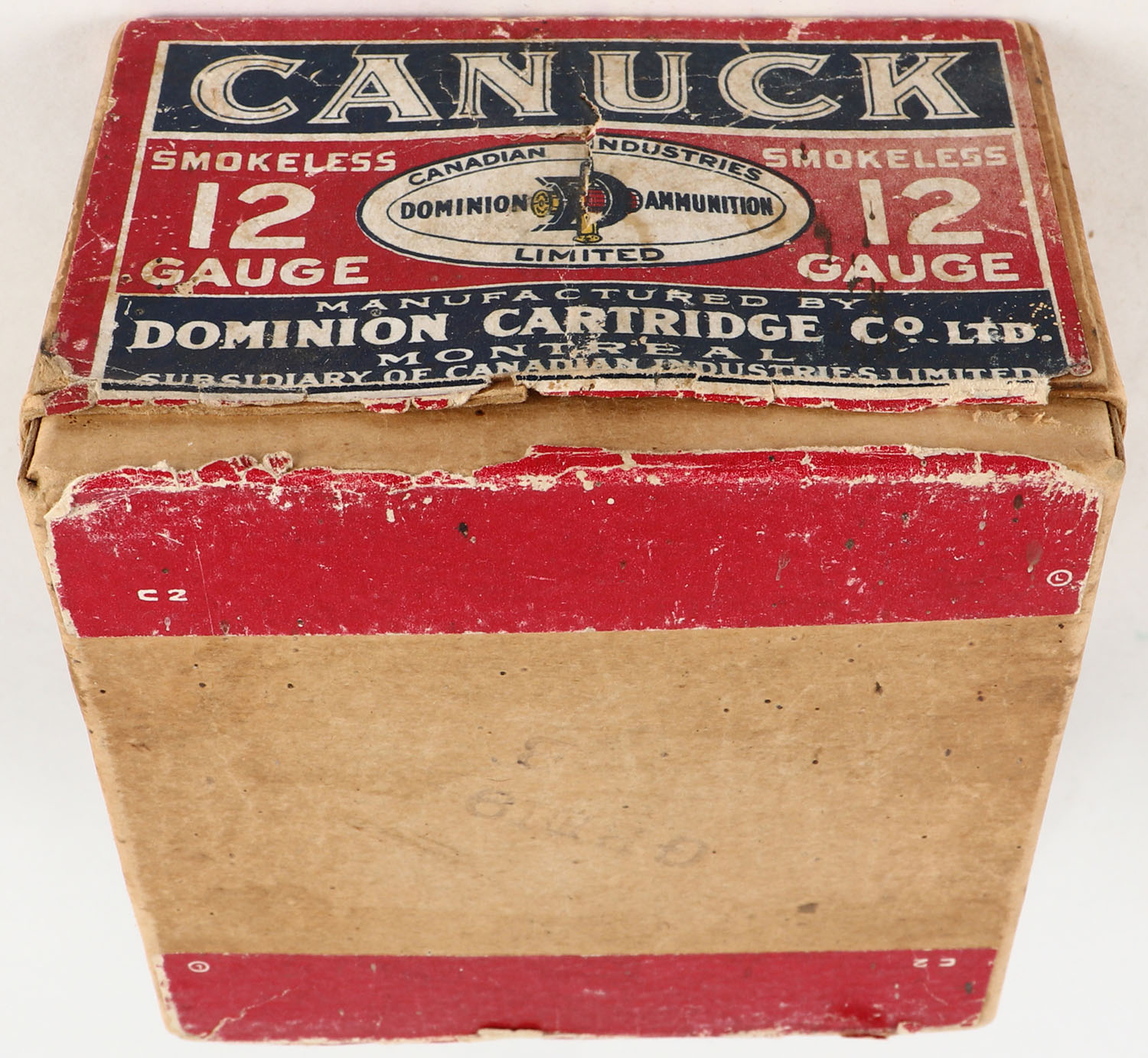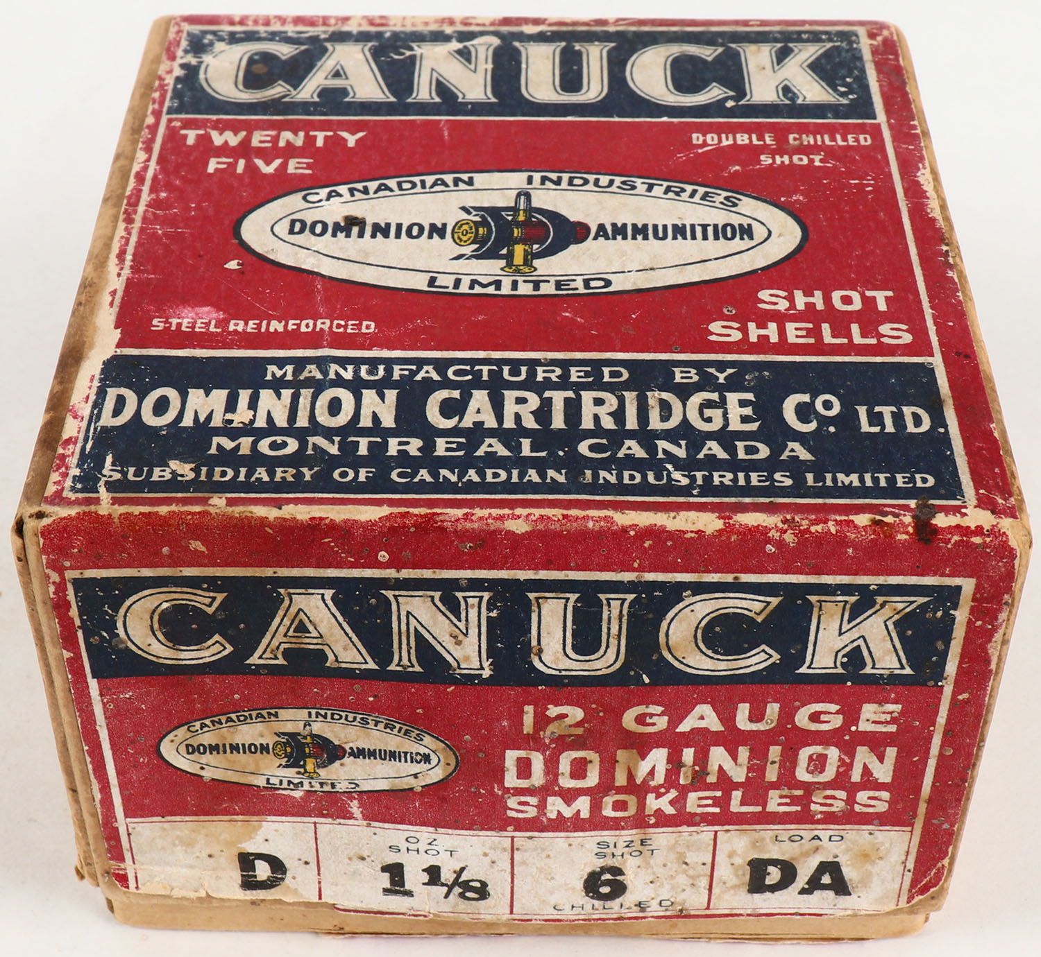 Dominion Cart. Co., Canuck, 12ga., 2pc., Empty, shot size 6CH, red, blue & white box, box has scuffing & soiling with edge wear, box is solid with nice colors, HARD TO FIND BOX! Grade: Very Good ++ - Value: 40 to 200