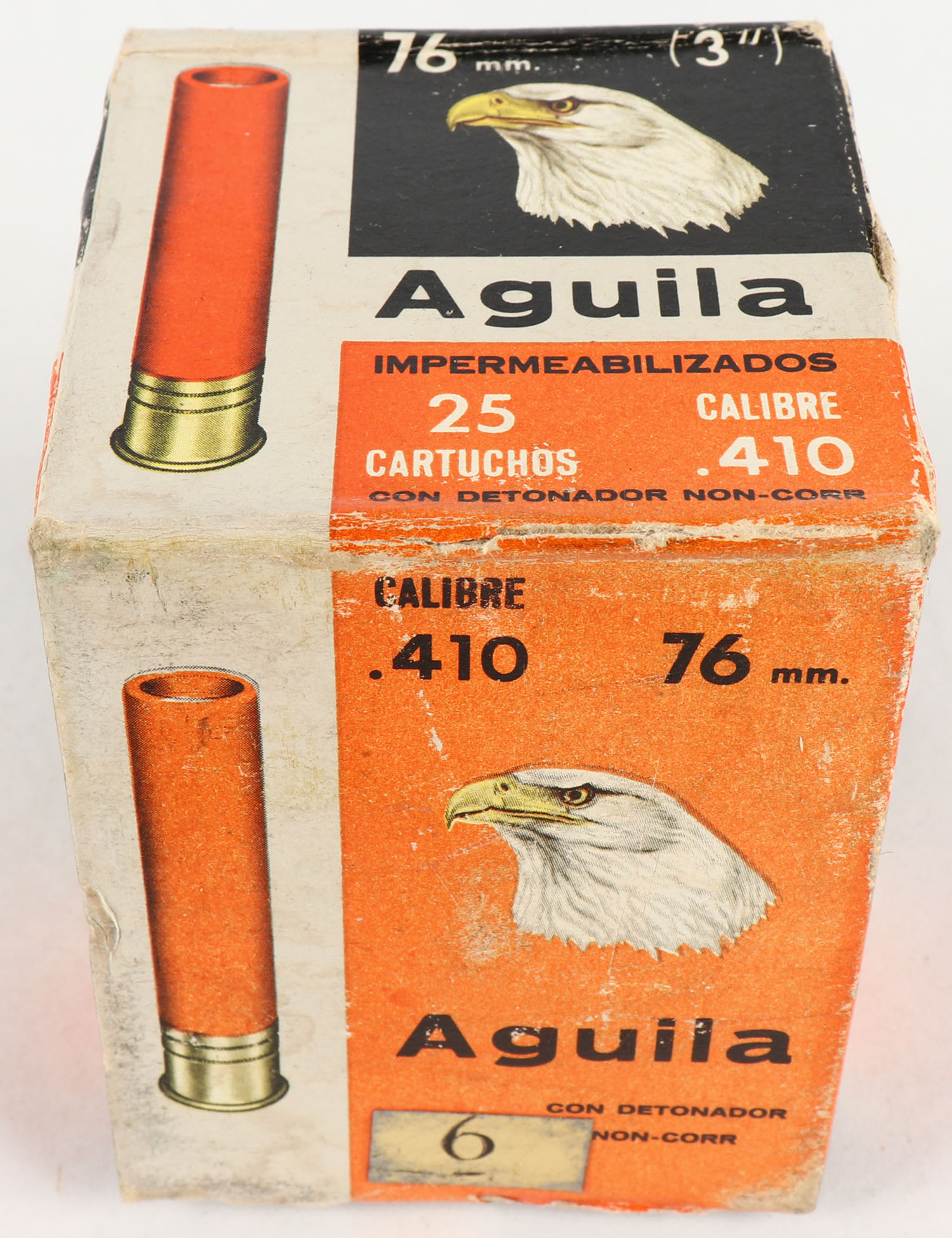 Aguila, 410ga., 3'', 1pc., Full, shot size 6, box is orange, black, and white, box has a seam split & scuffing, paper shells are excellent. Grade: Very Good - Value: 10 to 40