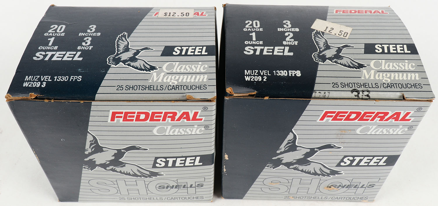 Lot of 2 Federal, 20ga., 1pc., Appears Full, shot size 2 & 3, multi-colored boxes. Grade: Excellent - Value: 10 to 30