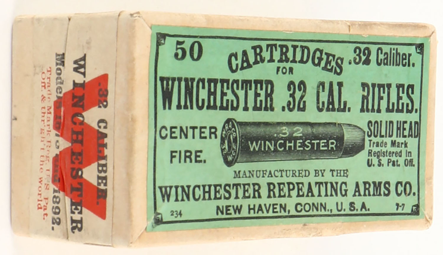 Winchester, .32 Winchester, Solid Head, FULL & SEALED, 1pc. Buff box with green top & buff side sealing labels, box is solid with excellent color, very minor age soiling, stain on front, corners are mostly sharp, edges are mostly crisp, labels are intact. Grade: Excellent ++ - Value: 150 to 450