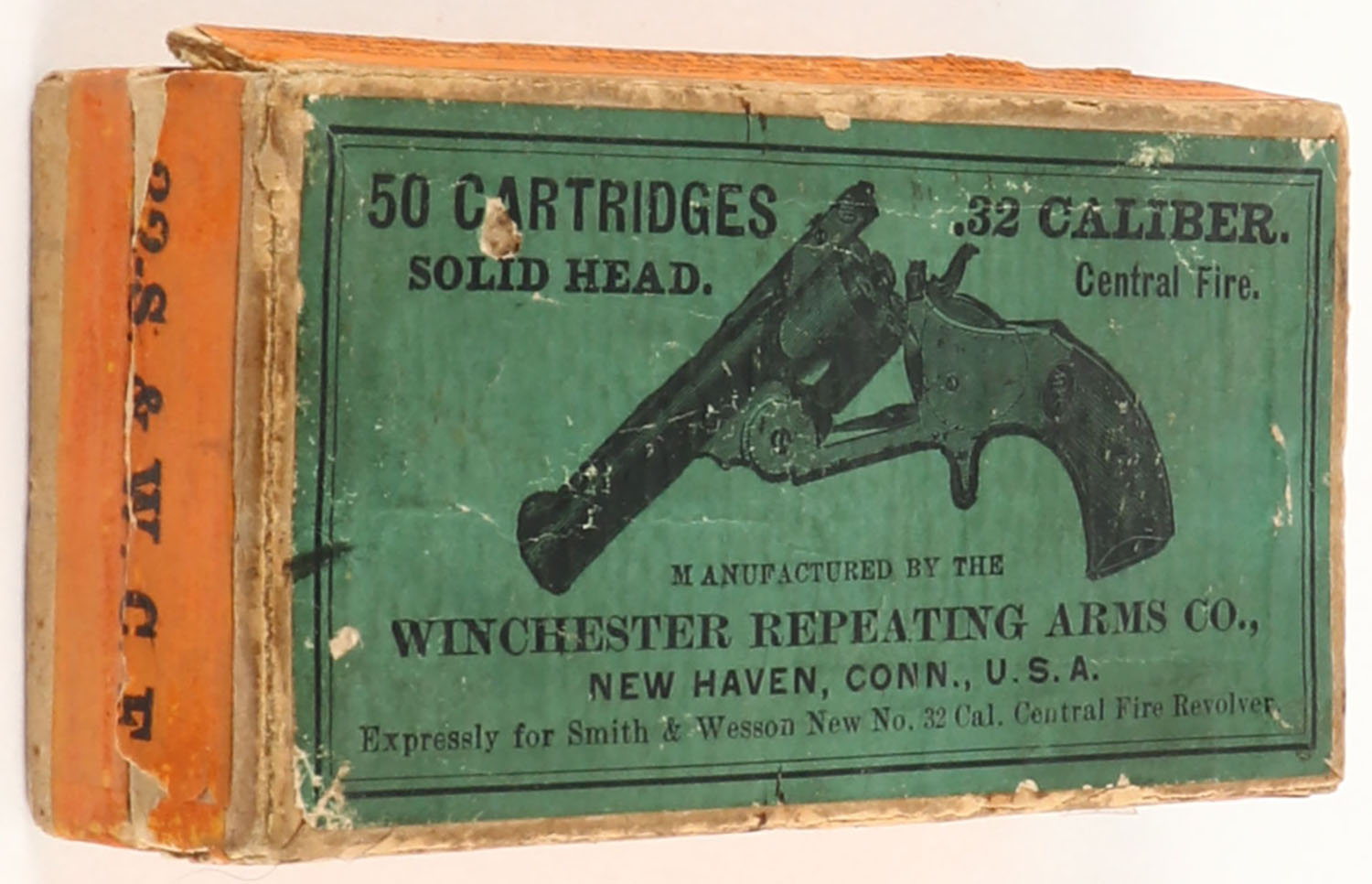 Winchester, Central Fire, .32 Smith & Wesson, Full of mixed H/S, 2pc. Buff box with green top & orange side sealing labels, box is solid with very good to excellent color, very minor age soiling & shelf wear, vertical seam splits to all corners of lid, edge & corner wear, labels are intact, ammo is excellent. Grade: Very Good - Value: 10 to 50