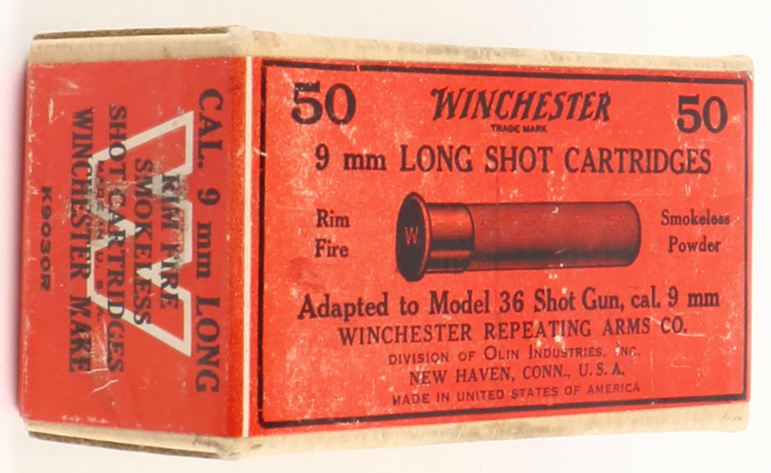 Winchester, 9mm Long Shot Cartridges, Rim Fire, FULL & SEALED, 2pc. Buff box with red wraparound label, box is solid with excellent color, very minor color fading & shelf wear, very minor corner wear, edges are crisp, label is intact. Grade: Excellent + - Value: 150 to 450