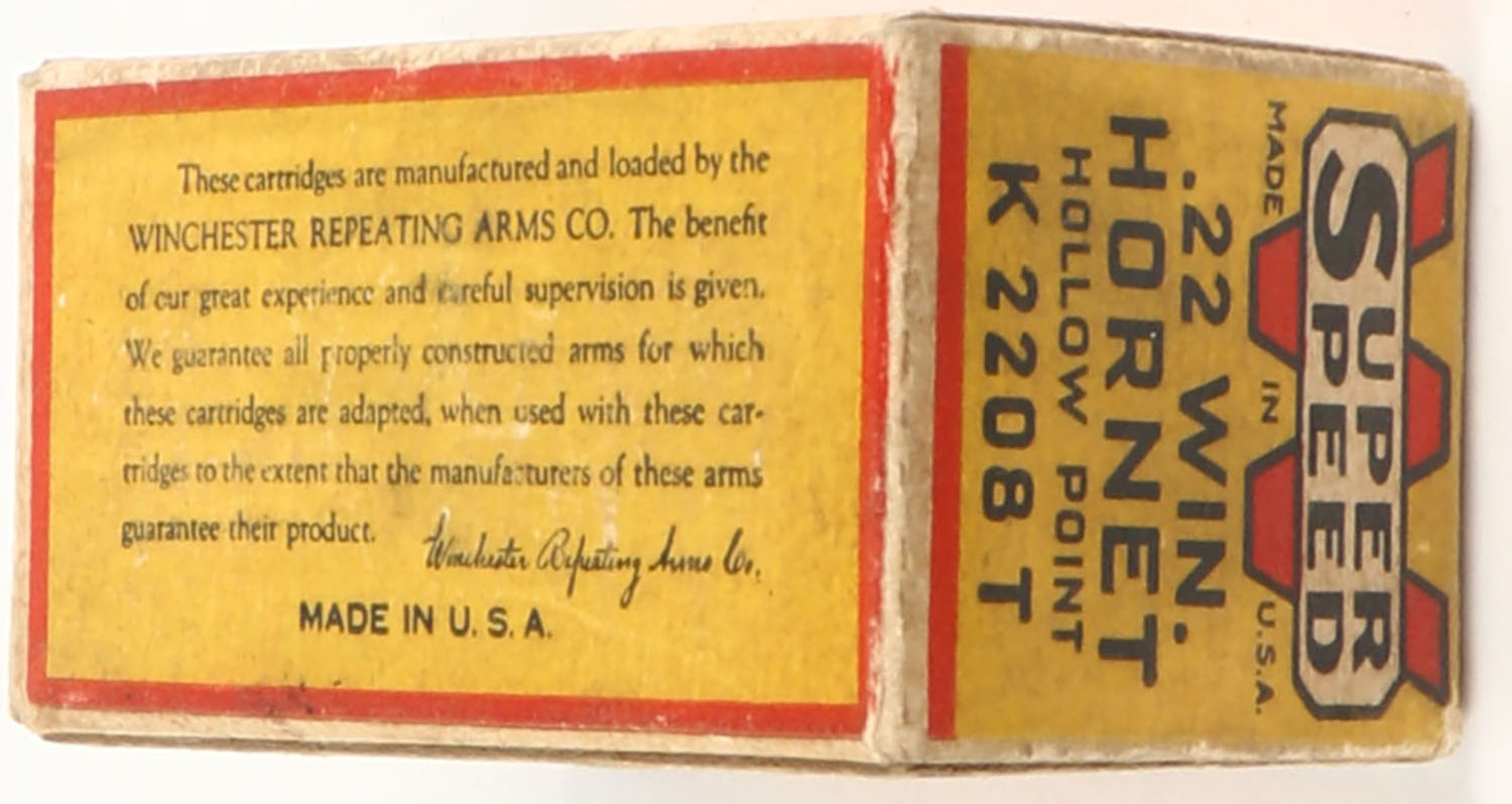 Winchester, Super Speed, .22 Winchester Hornet, 46 Grain Hollow Point, Full, 1pc. Yellow red & black box, box is solid with very good to excellent color, minor age soiling & shelf wear, very minor corner wear, edges are mostly crisp, end flaps are solid, ammo is excellent. Grade: Excellent - Value: 80 to 240