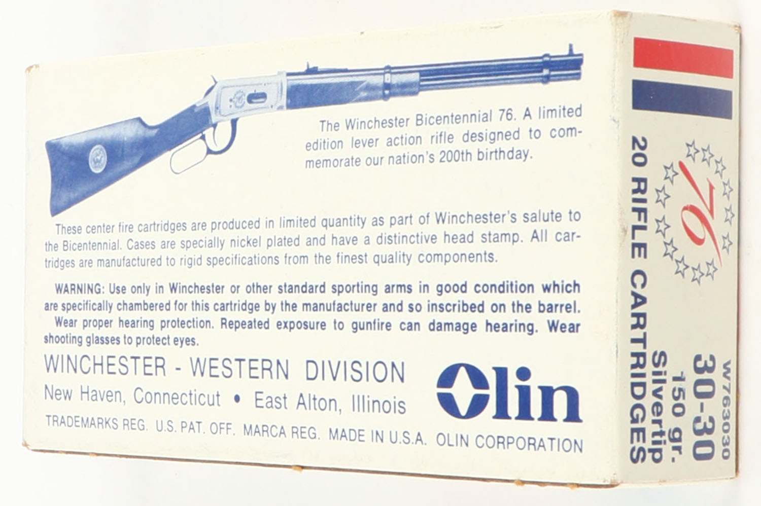 Winchester, Bicentennial, .30-30 Winchester, 150 Gr. Silvertip, Full, 1pc. White blue & red box, box is solid with excellent color, very minor corner wear, edges are crisp, end flaps are solid, ammo is minty. Grade: Excellent ++ - Value: 20 to 60