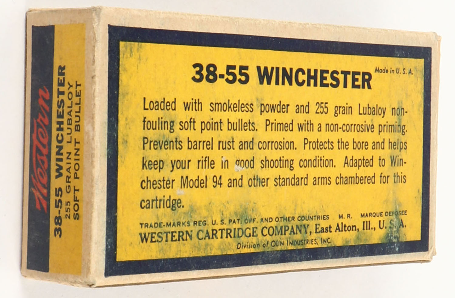 Western, Lubaloy Cartridges, .38-55 Winchester, 255 Grain Soft Point Bullets, Full, 1pc. Yellow blue & red bulls eye box, box is solid with very good to excellent color, some shelf & corner wear, very minor edge wear, end flaps are solid, ammo is excellent. Grade: Very Good ++ - Value: 30 to 90
