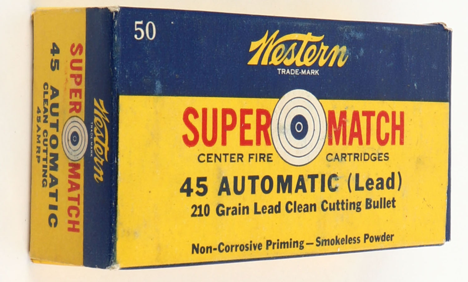 Western, Super Match, .45 Automatic, 210 Grain Lead Clean Cutting Bullet, Full, 1pc. Yellow & blue box, box is solid with excellent to minty color, very minor shelf & corner wear, edges are crisp, end flaps are solid, ammo is excellent to minty. Grade: Excellent ++ - Value: 20 to 60
