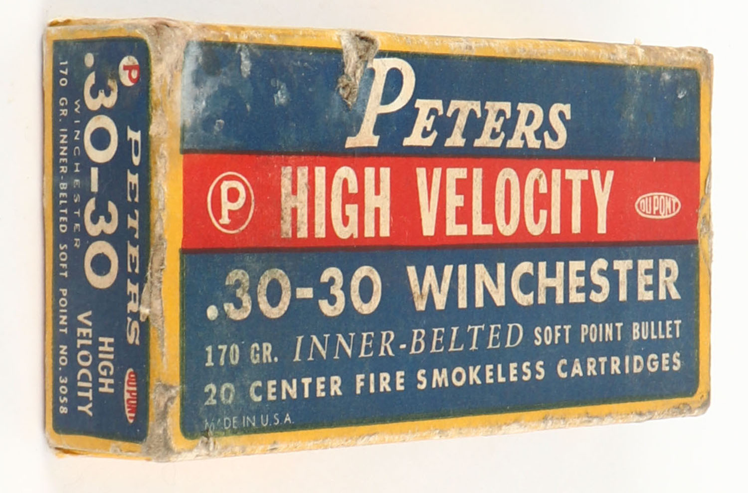 Peters, High Velocity, .30-30 Winchester, 170 Grain Inner-Belted Soft Point Bullet, Full, 1pc. Blue yellow & red box, box is solid with very good color, some age soiling & shelf wear, some edge & corner wear, end flaps are solid, ammo is excellent. Grade: Very Good + - Value: 16 to 60