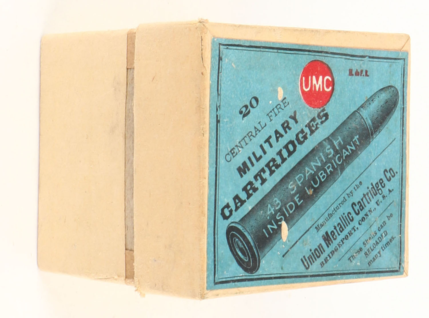 UMC, Military Cartridges, .43 Spanish, Over-Full, 27rds. (Rds. are standing up in box), 2pc. Buff box with blue label, box is solid with excellent color, very minor shelf wear, corners are mostly sharp, edges are mostly crisp, label is intact, ammo is excellent. Grade: Excellent ++ - Value: 40 to 120