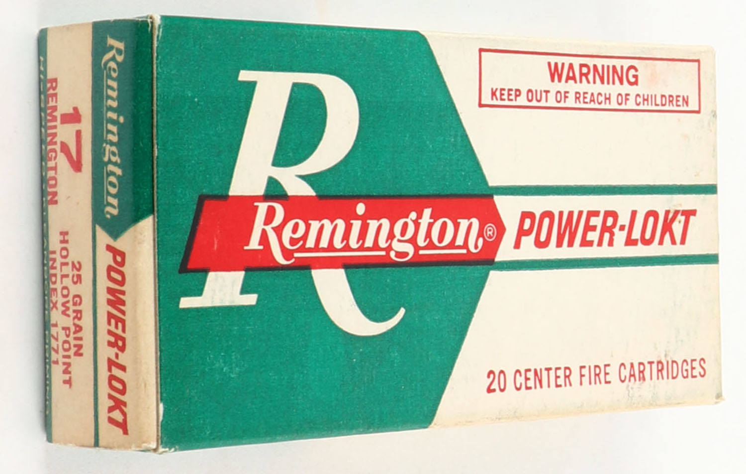Remington, Power-Lokt, .17 Remington, 25 Grain Hollow Point, Full, 1pc. White green & red box, box is solid with excellent color, ammo is excellent. Grade: Excellent + - Value: 20 to 60