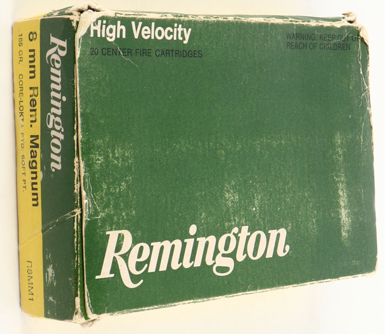 Remington, High Velocity, 8 mm Rem. Magnum, 185 Grain Core-Lokt Pointed Soft Point, Full, 1pc. Yellow, green, white & black box, box has soiling with edge wear, ammo is very good. Grade: Good ++ - Value: 20 to 60