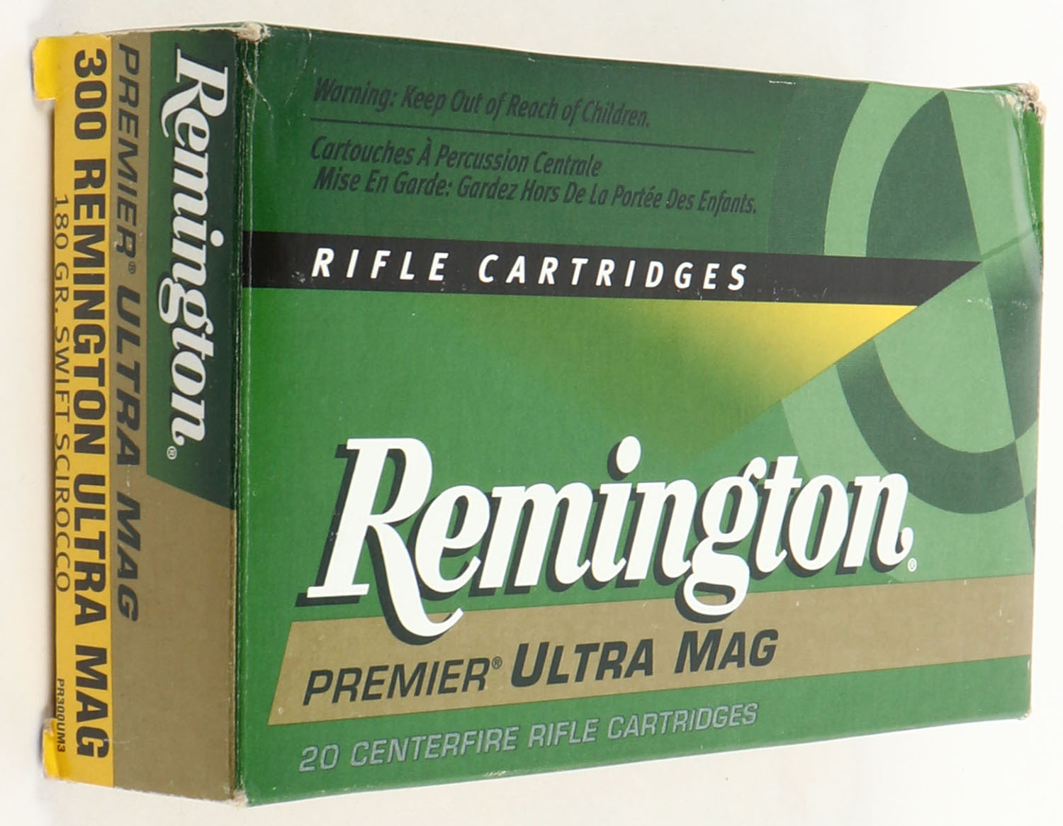 Remington, Premier Ultra Mag, 300 Remington Ultra Mag, 180 Grain Swift Scirocco, 1pc, Full, multi-colored box, box is solid with some corner wear, ammo is excellent. Grade: Excellent + - Value: 30 to 90