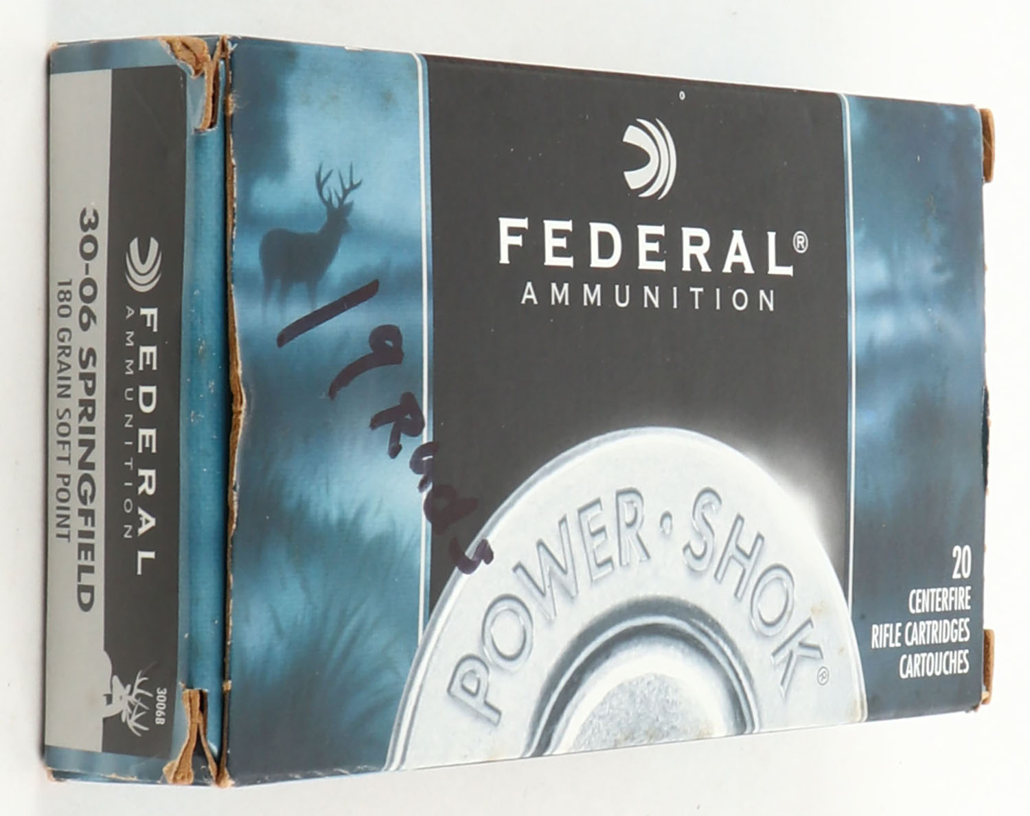 Federal, Power-Shok, 30-06 Springfield, 180 Grain SP, Partial 19rds, 1pc. multi-colored box, box is solid with some corner wear, ammo is excellent. Grade: Very Good ++ - Value: 20 to 60