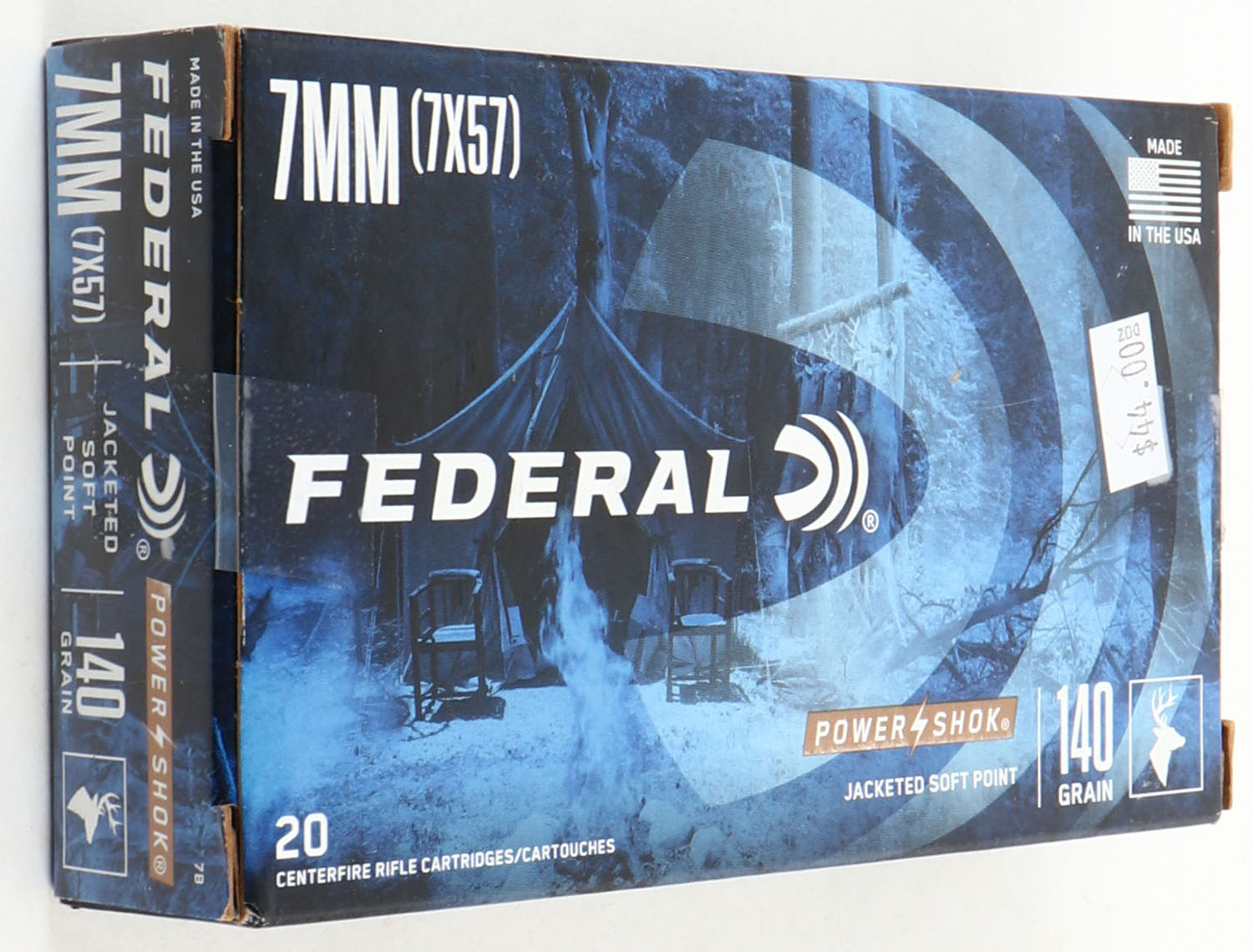 Federal, Power Shok, 7mm, 140 Grain JSP. Full, 1pc. Multi-colored box, box is solid with excellent color, ammo is minty. Grade: Excellent - Value: 16 to 60