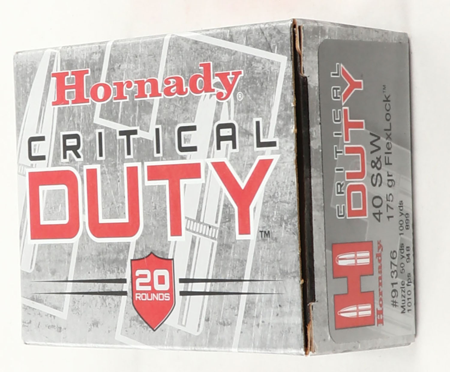 Hornady, Critical Duty, .40 Smith & Wesson, 175 Grain FlexLock, Full, 1pc. Multi-colored box, box is very solid with excellent color, ammo is minty. Grade: MINT - Value: 16 to 60