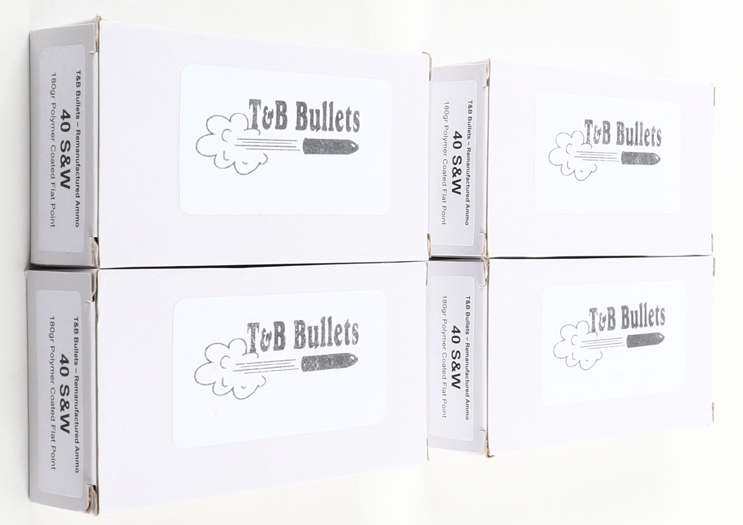 T&B Bullets, Lot of (4), .40 Smith & Wesson ammo boxes,, Remanufactured Ammo by a class type 7 Ammo MFG (this is the same class (high quality) as Winchester, Federal and or CCI), 180 Grain Polymer Coated Flat Point bullet, loaded cartridges, 1pc, Full 50 count boxes, white boxes are very solid, ammo is minty. Grade: Excellent ++ - Value: 20 to 100