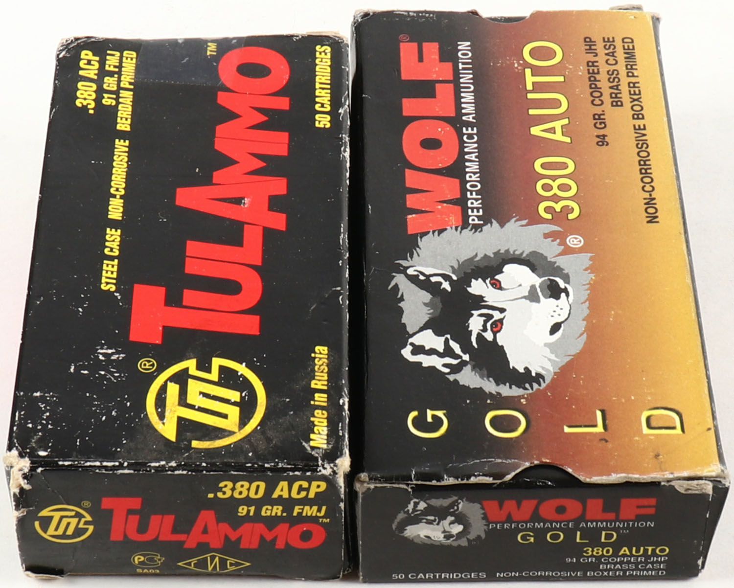 Wolf/Tulammo, Lot of (2), 380 Auto, 94 & 91 Grain, Full, 1pc, multi-colored boxes, boxes have age soiling & scuffing, ammo is excellent. Grade: Very Good - Value: 20 to 50