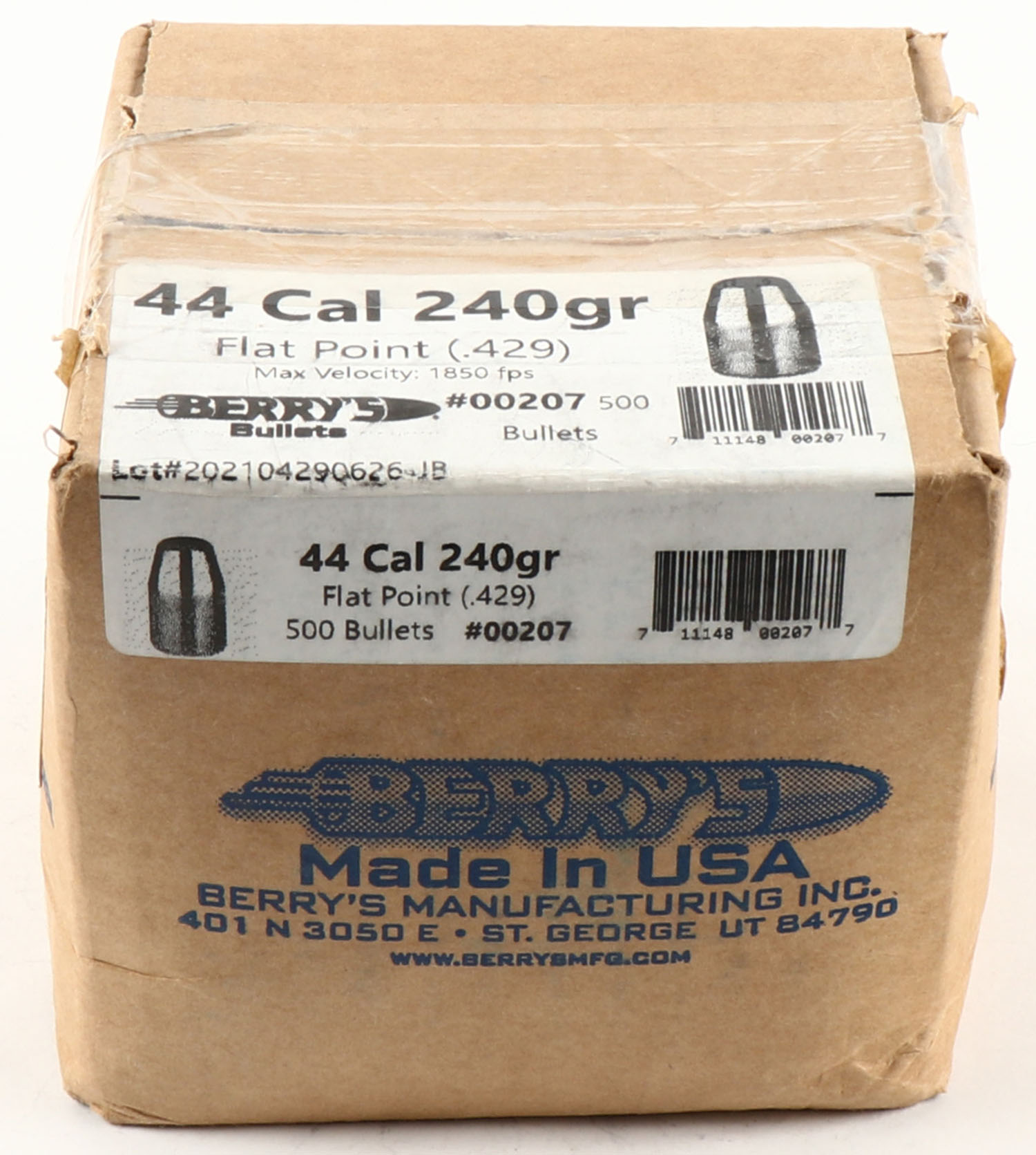 Large lot of Berrys Bullets, 44 Cal, 240 gr, (.429), flat point, box appears full and displays 500 ct. Grade: Mint - Value: 20 to 100