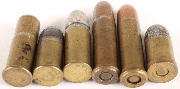 Lot of 6. French Manufactured Cartridges. (1) 9mm French Thick Rim. NHS. RN Lead. (1)n .38 S&W Revolver, HS:''GG 38 S&W), RN Lead, Inside Primed by Gevelot. (1) 8mm French Lebel Revolver, HS:''S.F. / 39 / I /4 /'', FN CJ FMJ''. (1) 8mm French Lebel Revolver, HS:''ECP / 11 / P / 3 /'', FN CJ FMJ. (1) 9mm French Revolver, HS:''GG D 9 m/m'', RN Lead, Inside primed by Gevelot. (1) .380 Revolver (Shot), HS:''GG 380'', Extended neck with white wad at casemouth, Inside Primed by Gevelot. (1) 11mm French Military revolver. HS:''ECP / Grade: Very Good - Value: 20 to 40