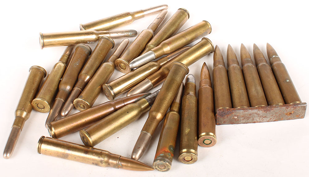 Lot of 24. Military rifle cartridges. (9) 6.5x53mmR Mannlicher --by US Cartridge. (8) 7.65x53 Mauser by Argentina & stripper clip. (2) 30-40 Krag by Frankford Arsenal, (2) 30-06 Springfield Gallery by Remington-Hoboken. (1) 7mm Mauser by Winchester. (1) 6.5mm Italian by Bologna-1917. (1) 8x50mm Mannlicher by George Roth-1915. Grade: Very Good - Value: 20 to 40