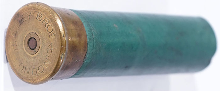 Eley Bros., No 4, NPE, 4 ga. green paper, 4'' OAL, solid shell. Grade: Excellent + - Value: 20 to 60