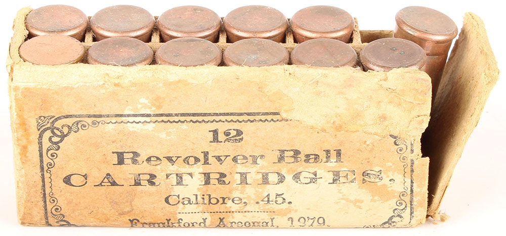 RARE!! Frankford Arsenal, Cal .45 Revolver Ball Cartridges, dated 1879, 1pc, Full. Buff box & label with black print. The box is missing the top & part of back, has three corner seam splits, light age soiling, tears in label, scuff marks & edge wear, ammo is very good. Grade: Very Good - Value: 100 to 200