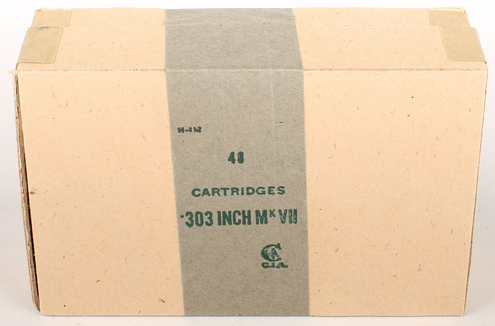 Quebec Co. LTD, .303 inch Mk VII (.303 British), 2pc, FULL & SEALED, brown box with gray label & green print, box has one split seam on top, & light rub wear. Grade: Excellent + - Value: 30 to 60