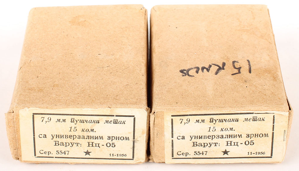 Lot of two, Yugo, 7.9mm (8mm Mauser), 15 Count boxes, 1956 dated, on clips, 1pc, both Full, 30 Rds. total, buff boxes & labels with black print, boxes have pen marks, rub wear & handling wear, ammo is excellent, has corrosive primers. Grade: Very Good ++ - Value: 10 to 30