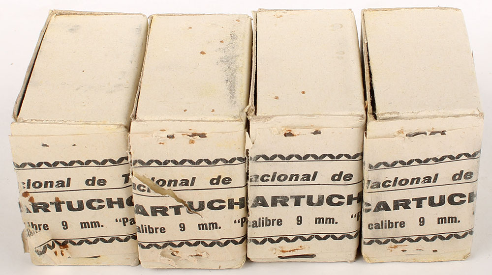 Lot of four, Fabrica Nacional de Toledo (Spanish), 9mm Parabellum (9x19mm), 25 count boxes, brass case, ammo in open boxes dated 1951, 1pc, two SEALED the others are open & full, total of 100 Rds., white box & label with black print, ammo ranges from excellent to very good, likely has corrosive primers. Grade: Excellent - Value: 20 to 60