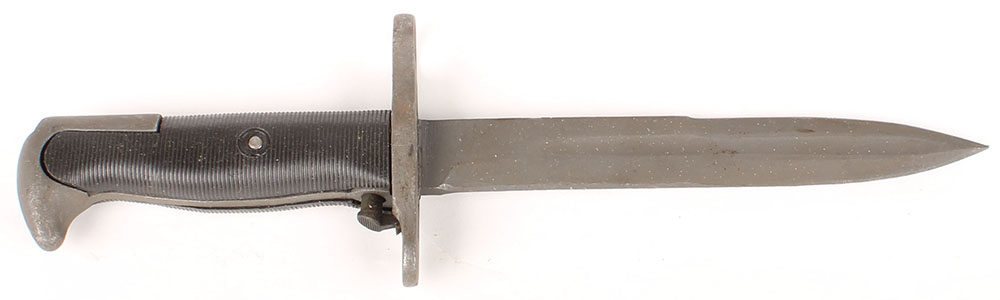 US, M5A1 Bayonet, no markings, black plastic grips, parkerized metal. Grade: Excellent - Value: 30 to 60