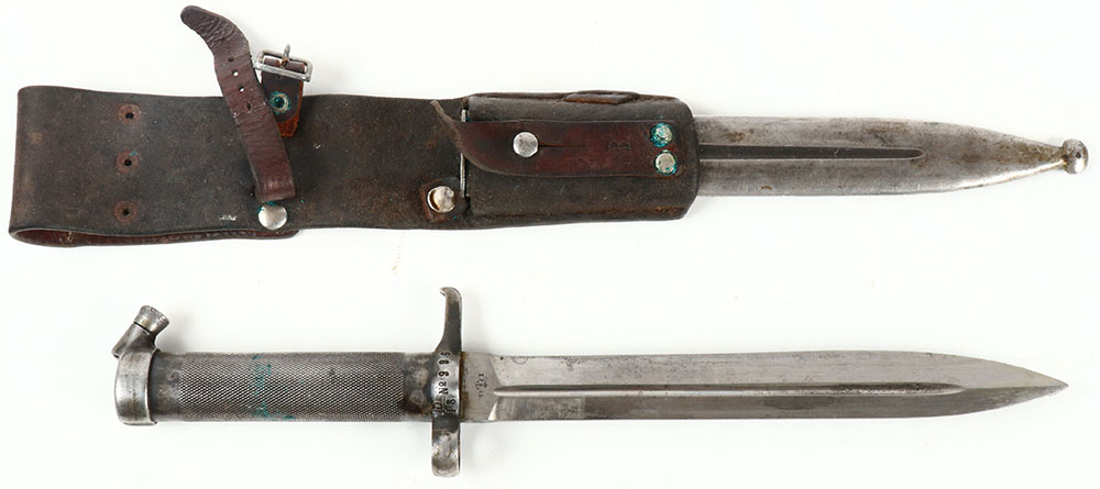 Swedish, Eskilstuna Jernmanufactur AB , M1896 Mauser bayonet with sheath & frog, checkered metal grip, unfinished metal, right side of blade marked with a crown, left side marked '' ''EJ'' crown over anchor over a ''E'', ''AB'', the top of the guard is marked with a crown, ''EJ'' crown over anchor over a ''E'', ''AB'', ''170''. S/N on sheath is ''449''. Grade: Very Good ++ - Value: 40 to 80