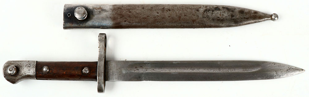 Turkish, Askari Fabrika, M1935 bayonet & sheath, smooth wood grips, unfinished metal with light patina speckling, guard is loose, left side of pommel marked with a faint ''ASFA'', right side of pommel marked ''205187''. Grade: Very Good + - Value: 20 to 40