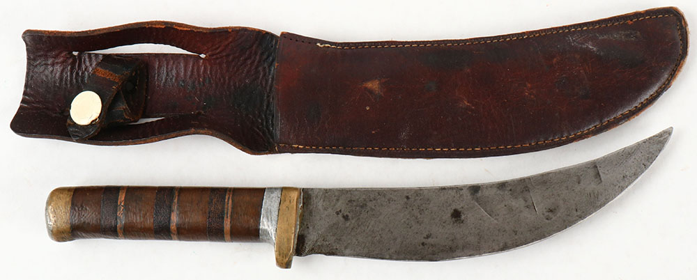 US, Theater made fighting knife with sheath, copper/wood grip, brass guard & pommel, curved steel blade, blade has spots of dark patina, 6'' blade, OAL 10 1/4''. Grade: Very Good ++ - Value: 20 to 60