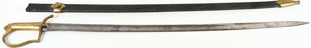 US, W.H. Horstmann & Sons, Naval Marine Officers sword, 1815-1820, with matching shagreen scabbard. Brass handle with spotty patina. Both sides of the blade is etched with intricate floral designs, American eagles, ''US'', & other American imagery, the right side of the blade is etched ''W.H.'', ''HORSTMANN'', ''& SONS'', ''PHILADELPHIA''. The spine of the blade is etched ''IRON PROOF''. The blade has a light speckling of dark patina. The scabbard is missing the throat piece. The leather has rub wear & small nicks, the brass furniture has light spotty patina. Grade: Excellent - Value: 150 to 400