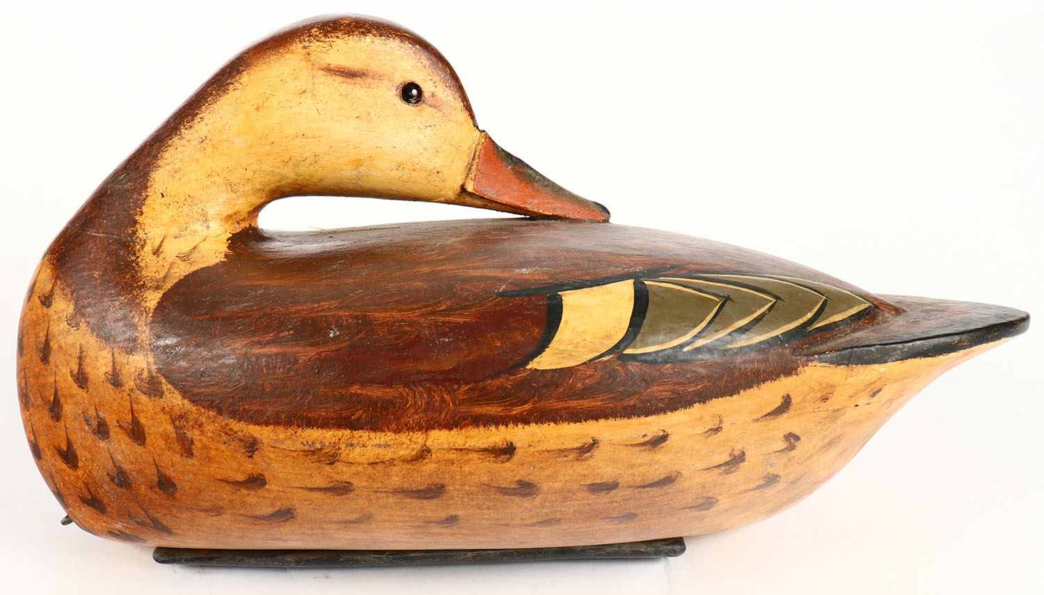 Preening Gadwall Hen by Jim Slack, Pekin, IL, glass eyes, hollow wood, excellent original paint, the Drake pair is in the previous lot, 12'' OAL. Grade: Excellent ++ - Value: 100 to 200
