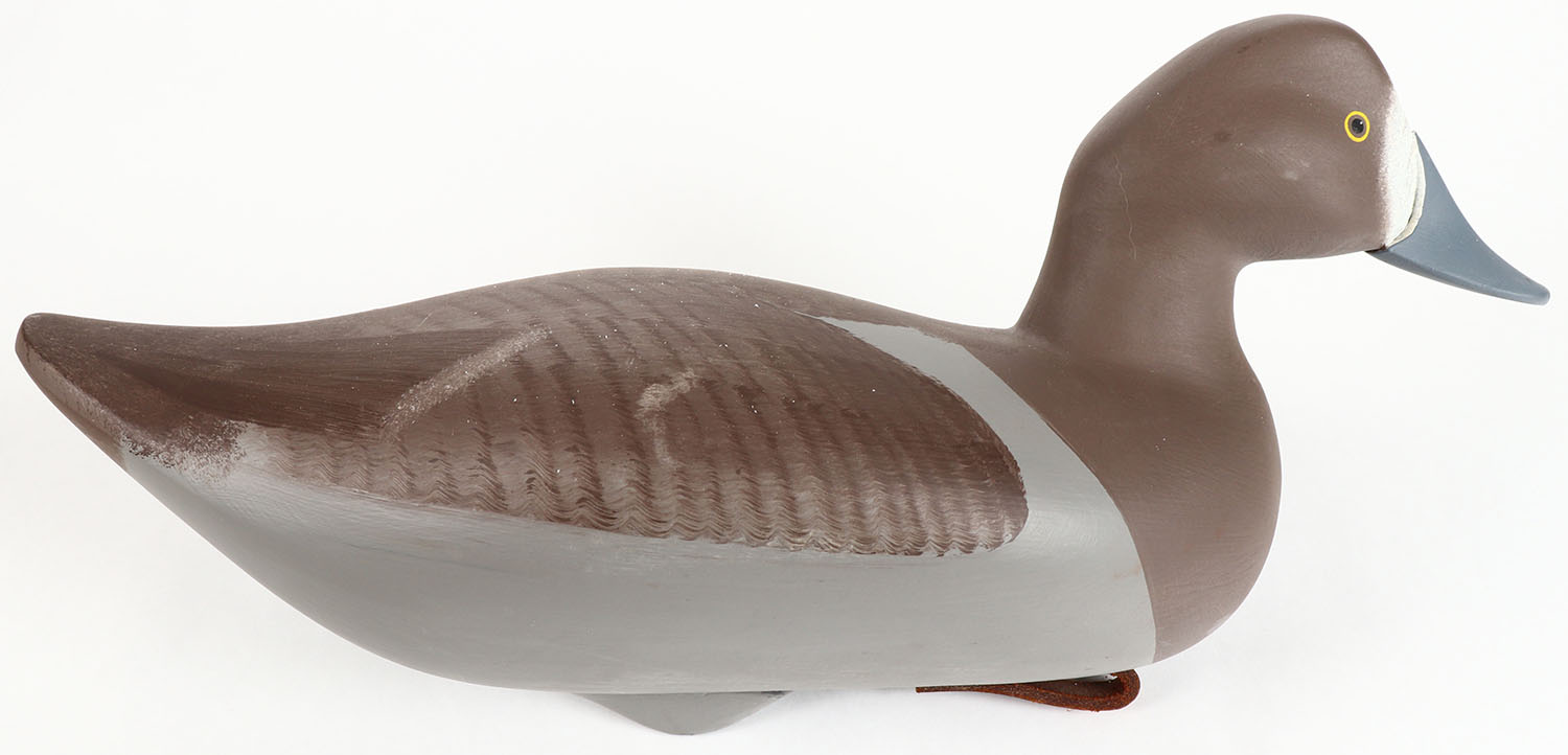 Bluebill Hen by Dan Carson, Havre De Grace, MD, PE, solid wood, original paint, structurally excellent, signed on bottom, 15'' OAL. Grade: Excellent ++ - Value: 40 to 80