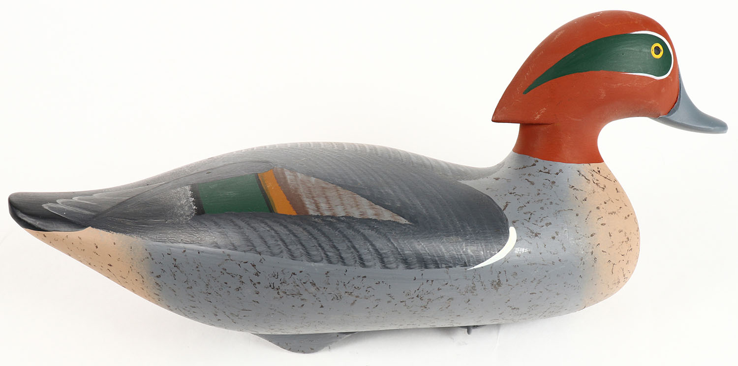 Greenwing Teal by Patrick ''Pat'' Vincent, Churchville, MD, painted eyes, solid wood, original paint, structurally excellent, signed on bottom, 13'' OAL. Grade: Excellent ++ - Value: 50 to 100