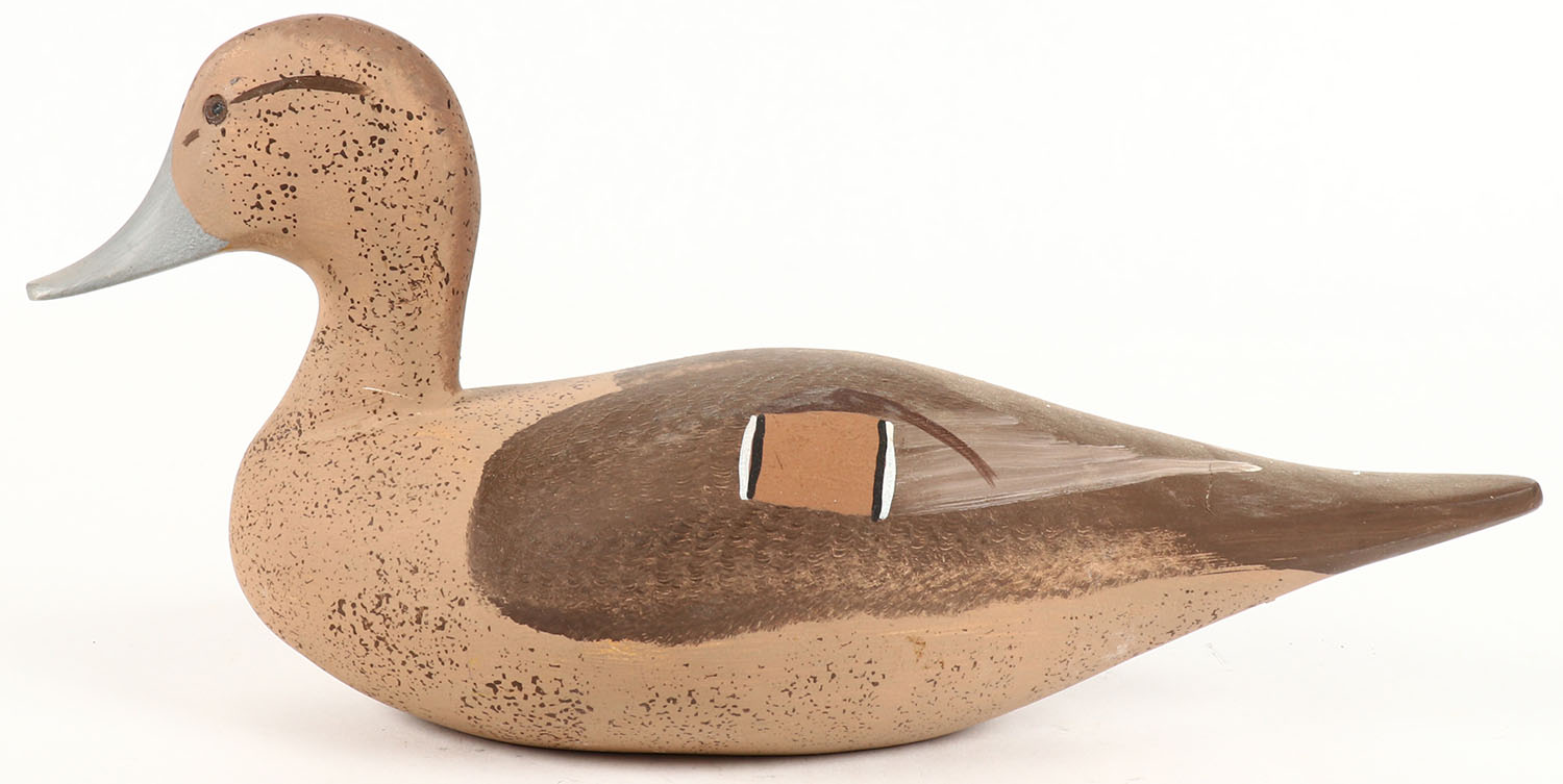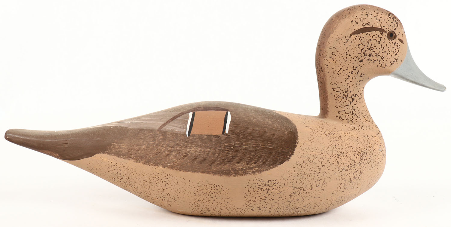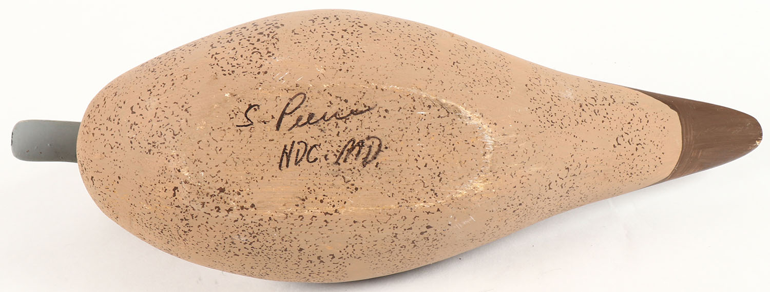 Miniature Pintail Hen by Jim Pierce, Havre De Grace MD, painted eyes, solid wood, structurally excellent, signed J. Peirce on bottom, 11'' OAL. Grade: Excellent ++ - Value: 30 to 60